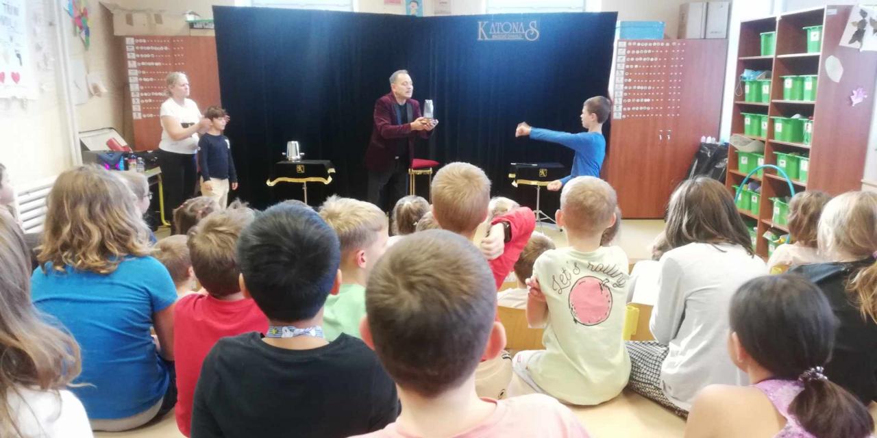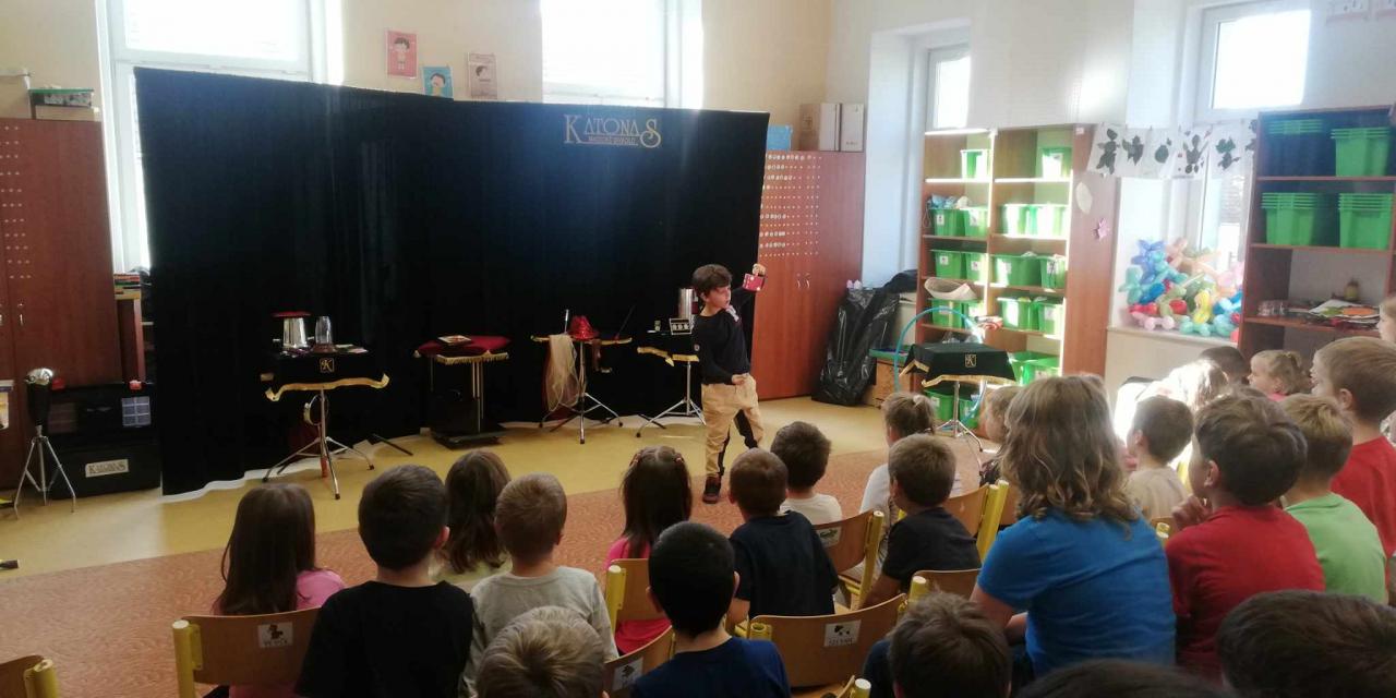 Na toto pondělí se děti z družiny na Požární hodně těšily. Po delší době nás navštívil kouzelník Katonas. Oslnil nás svými triky. Zábavné bylo i kouzlení jeho malého pomocníka. Po představení si každý odnesl balónek. Vychovatelky z Požární